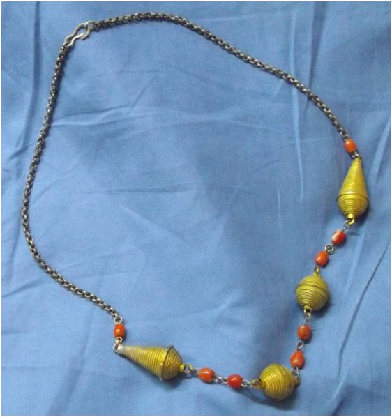 Selon la classification de Monhel, ce collier fait partie de la classe 2 des bijoux berbéro bédouins de Tunisie qui correspond à la période de migration des andalous en afrique du nord. Si la 1 ère classe des bijoux berbères en argent, de loin la plus ancienne, renferme les bijoux en argent massif sans adjonction de pierres, la 2 ème classe se distingue par l'innovation apportée par la venue des morisques et notamment les artisans juifs, en faisant appel aux nouvelles techniques comme la dorure, le sertissage de pierres ou l'emploi de la chaîne mécanique, plus économique et qui va supplanter la fameuse chaîne berbère millénaire fabriquée en anneaux soudés à la perpendiculaire ( A ce sujet, il y a lieu de consulter le livre de Monhel intitulé: " La fibule berbère, la Melia et le vœu de la paix", paru en mai 2015 et disponible sur la plateforme d'Amazon*).